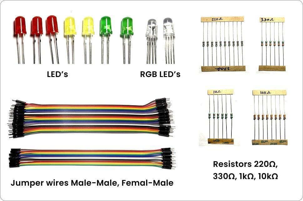 - LEDs (Red, Yellow, Green, RGB)